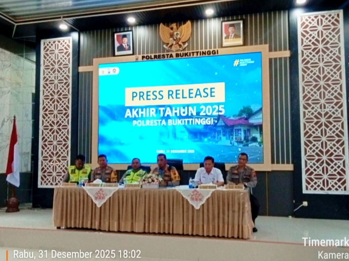 Bukittinggi –Dirgantaraku.com,-Kepolisian Resor Kota Polresta Bukittinggi menggelar konferensi pers akhir tahun 2025 pada Rabu (31/12/2025)bertempat di aula Polresta Bukittinggi,Sebagai bentuk evaluasi komprehensif terhadap situasi keamanan dan ketertiban masyarakat (kamtibmas) sepanjang tahun lalu. Kegiatan dipimpin langsung oleh Kapolresta Bukittinggi, Kombes Pol Ruly Indra Wijayanto, S.I.K., M.Si, yang memaparkan tren kriminalitas dan capaian kinerja kepolisian dengan nada tegas namun penuh komitmen.