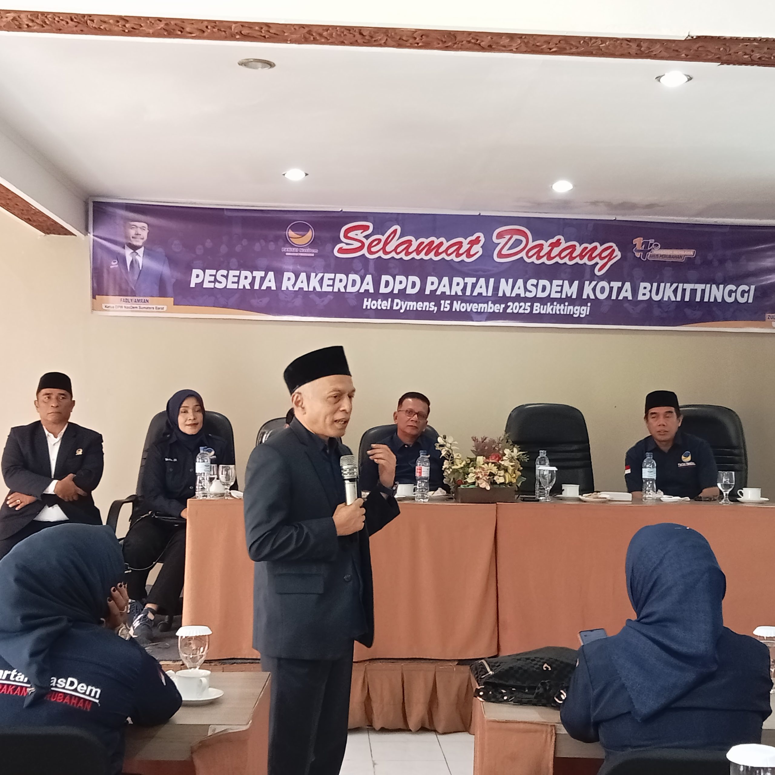 Bukittinggi –Minggu 15 November 2025,-Dirgantaraku.com,-Partai NasDem Kota Bukittinggi menggelar Rapat Kerja Daerah (Rakerda) di Hotel Dymens, Bukittinggi, hari ini. Acara ini mengusung tema “Konsistensi Membawa Arus Perubahan” dengan semangat baru dan energi baru untuk memajukan Bukittinggi.