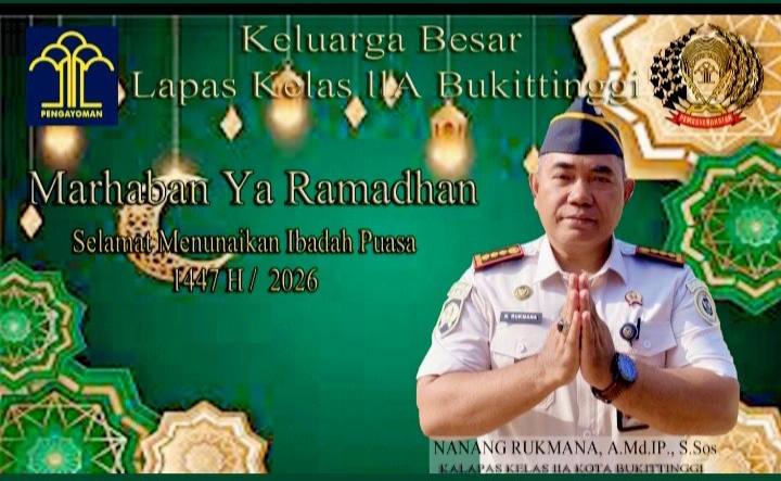 Bukittinggi-Dirgantaraku.com,-Kepala Lembaga Pemasyarakatan (Kalapas) Kelas IIA Bukittinggi, Nanang Rukmana A. Md.,IP.,S Sos, mengucapkan selamat menyambut bulan suci Ramadhan 1447 Hijriah/2026 Masehi kepada seluruh warga binaan, jajaran pegawai, serta masyarakat luas khususnya umat Islam di wilayah Bukittinggi dan sekitarnya. Dalam pesan resmi yang disampaikan, Kalapas mengajak semua pihak untuk merenungkan makna kedalaman ibadah puasa sebagai momentum untuk memperbaiki diri dan mendekatkan diri kepada Allah SWT.