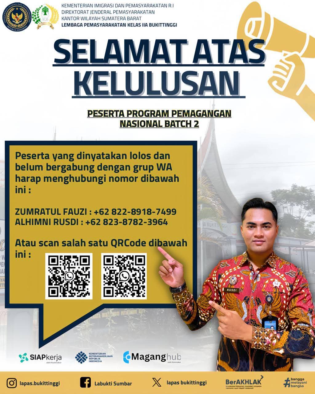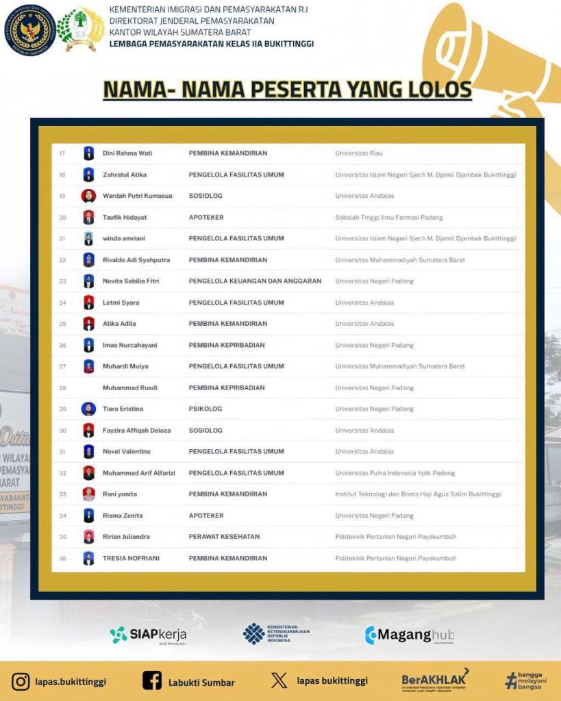 Dengan diterimanya peserta Program Pemagangan Nasional Batch 2 ini, Lapas Kelas IIA Bukittinggi semakin menegaskan perannya sebagai lembaga yang tidak hanya fokus pada pembinaan narapidana, tetapi juga peduli terhadap pengembangan sumber daya manusia Indonesia. Selamat kepada seluruh peserta yang telah dinyatakan lolos dan menjadi bagian dari keluarga besar Lapas Kelas IIA Bukittinggi!