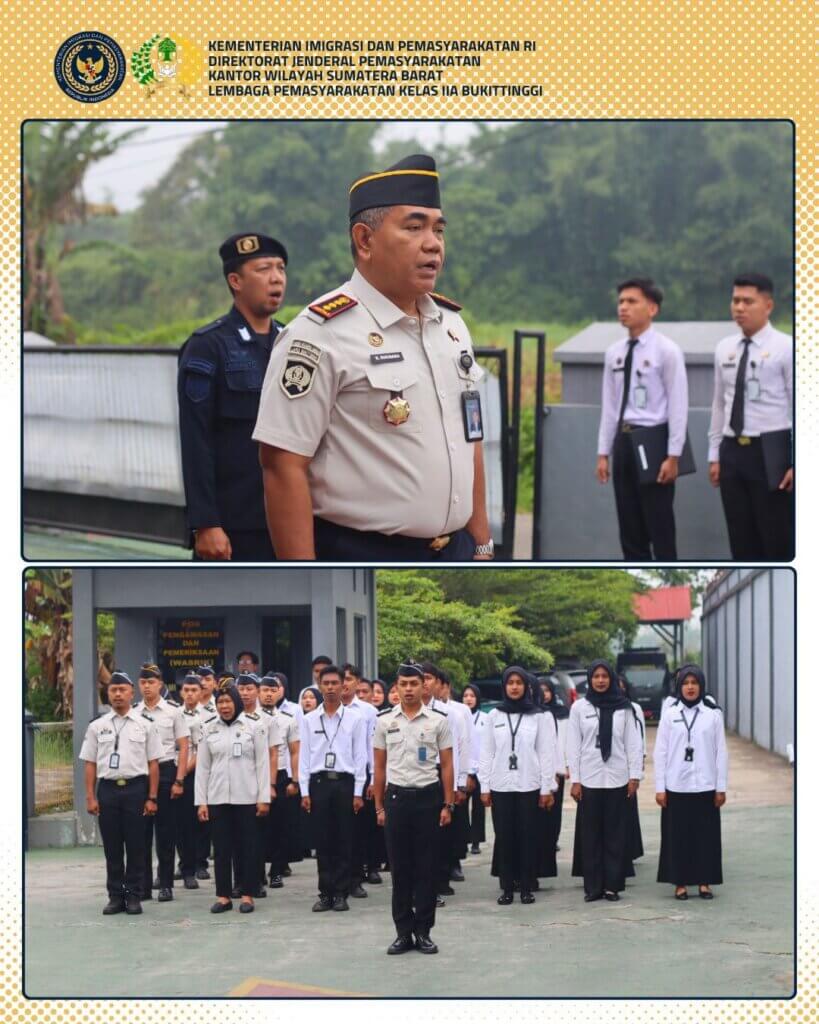 Apel pagi dipimpin secara langsung oleh Kepala Lapas (Kalapas) Kelas IIA Bukittinggi, Nanang Rukmana. Dalam amanatnya, Kalapas menekankan pentingnya menjaga kedisiplinan, meningkatkan tanggung jawab, serta mempertahankan komitmen tinggi dalam menjalankan tugas pemasyarakatan dengan standar profesional.