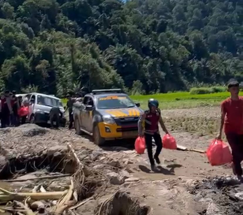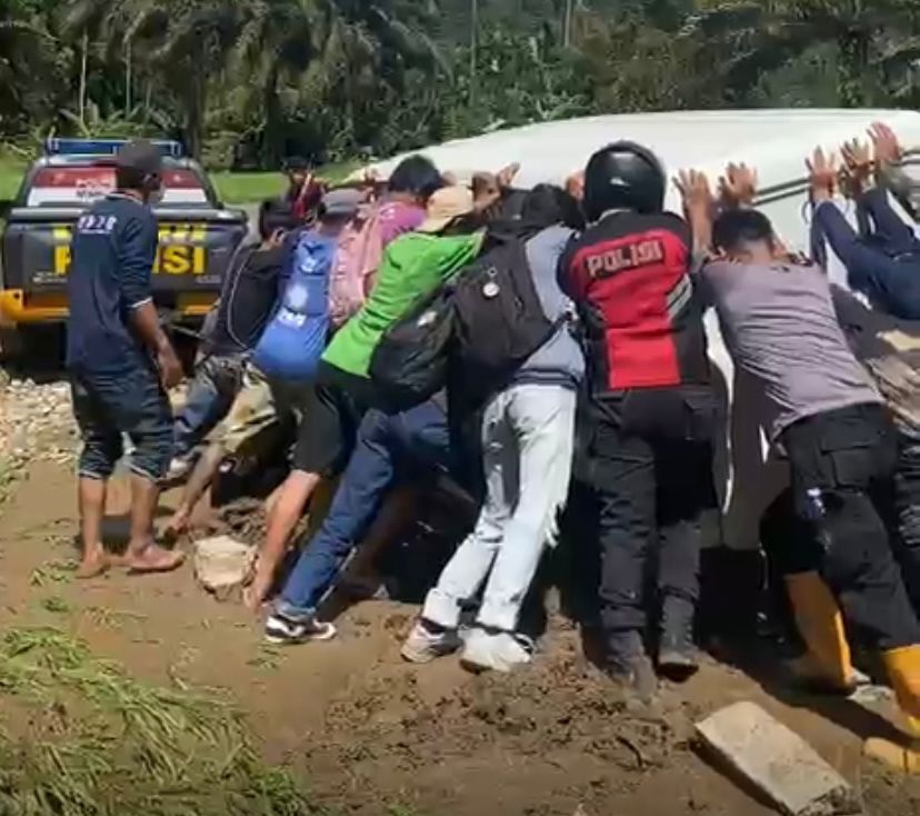Namun kondisi tersebut tidak mematahkan semangat. Dengan sigap, anggota Polresta Bukittinggi bersama tim lapangan dan warga setempat bergotong royong mengevakuasi kendaraan dan memastikan bantuan tetap diteruskan.