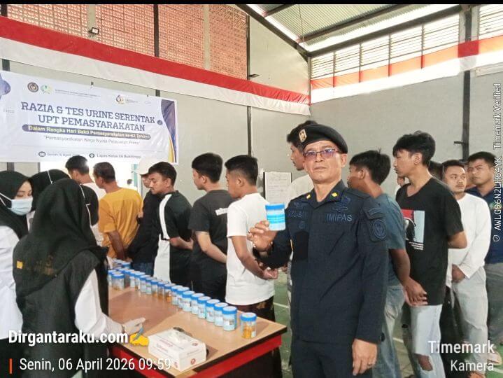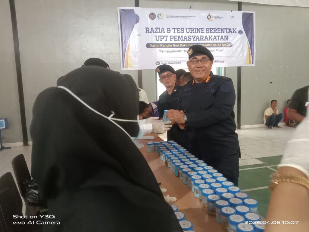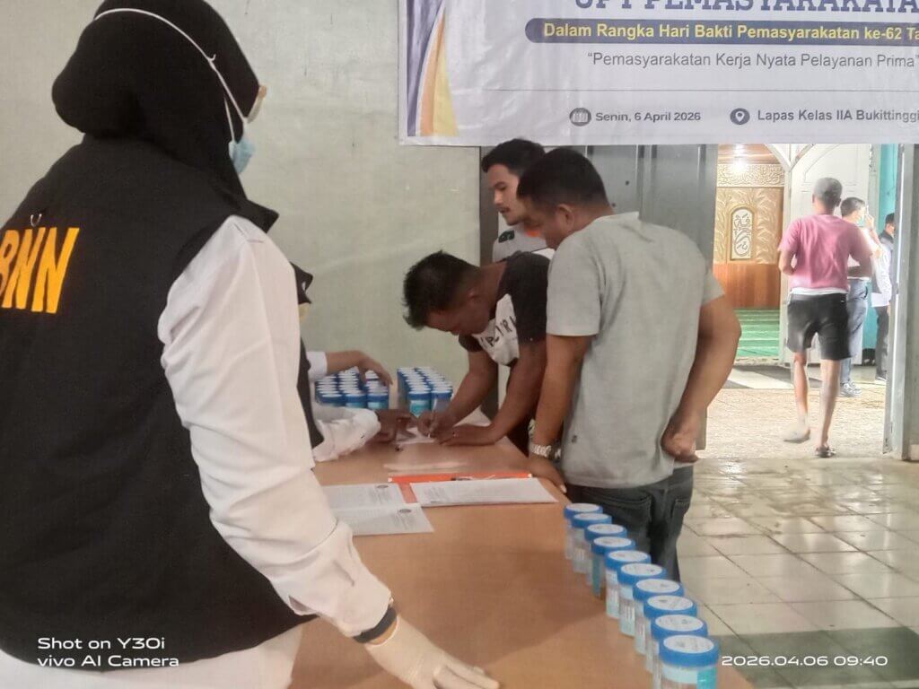 BUKITTINGGI, Dirgantaraku.com – Dalam rangka memperingati Hari Bhakti Pemasyarakatan (HBP) ke-62, Lembaga Pemasyarakatan Lapas Kelas IIA Bukittinggi menggelar kegiatan tes urine massal. Kegiatan ini diikuti oleh Warga Binaan Pemasyarakatan (WBP) maupun seluruh jajaran pegawai sebagai wujud komitmen nyata memerangi penyalahgunaan narkotika di lingkungan pemasyarakatan.