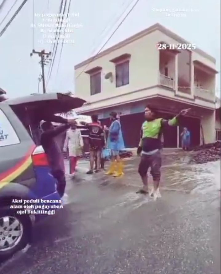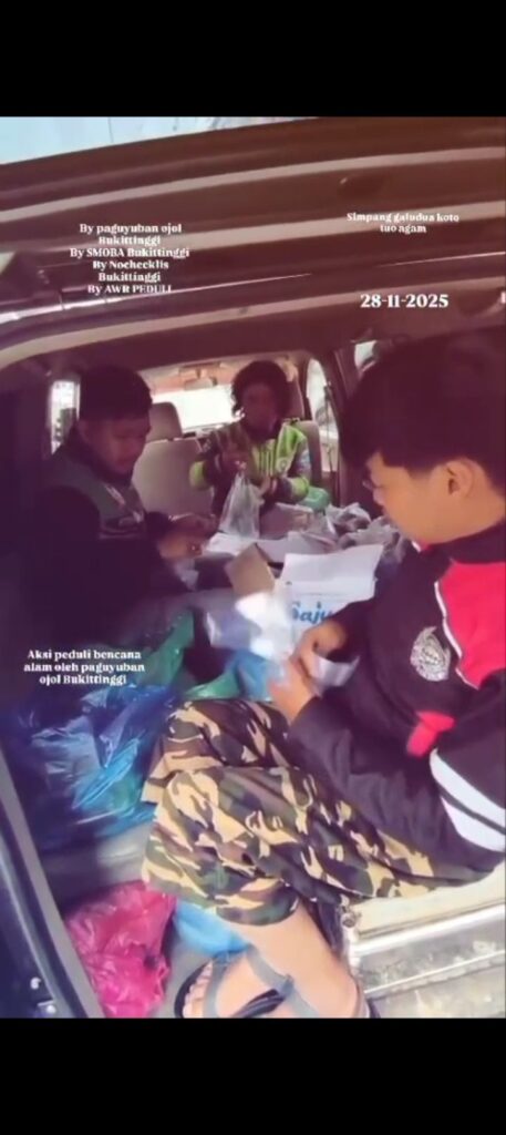 Bukittinggi, 28 November 2025 – Paguyuban Ojol (Ojek Online) Bukittinggi menggelar aksi sosial langsung kepada korban bencana longsor dan banjir di Simpang Galudua, Nagari Koto Tuo. Aksi ini menjadi bukti nyata kepedulian anggota paguyuban terhadap musibah yang mengguncang wilayah Sumatera Barat dalam beberapa hari terakhir.