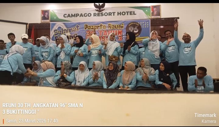 Bukittinggi-Dirgantaraku.com,-Panitia HIMASMA SMAN 3 Bukittinggi menyampaikan rasa puas dan senang atas kesuksesan acara reuni 30th alumni angkatan 96 yang digelar pada hari Senin, 23 Maret 2026. Acara yang berlangsung di Hotel Campago Resort Bukittinggi dari pukul 08.00 WIB hingga 18.00 WIB mendapatkan apresiasi luar biasa, dengan ucapan terima kasih yang disampaikan kepada seluruh panitia serta rekan-rekan alumni yang telah menyumbangkan tenaga dan materi untuk mendukung kelancaran kegiatan tersebut.