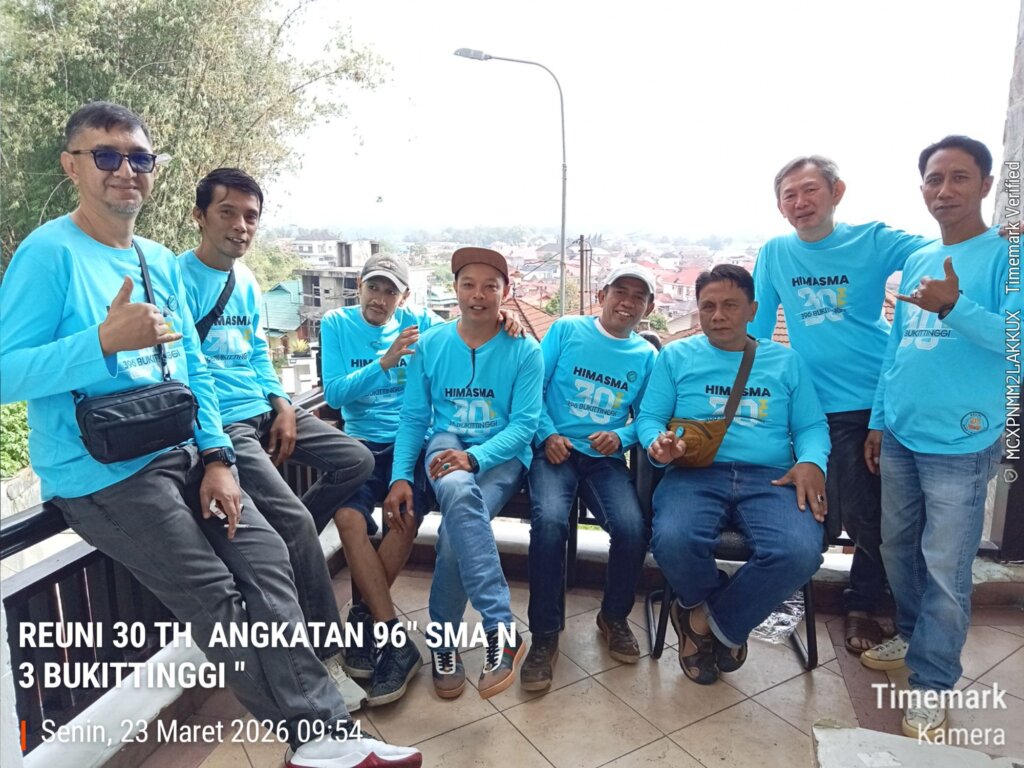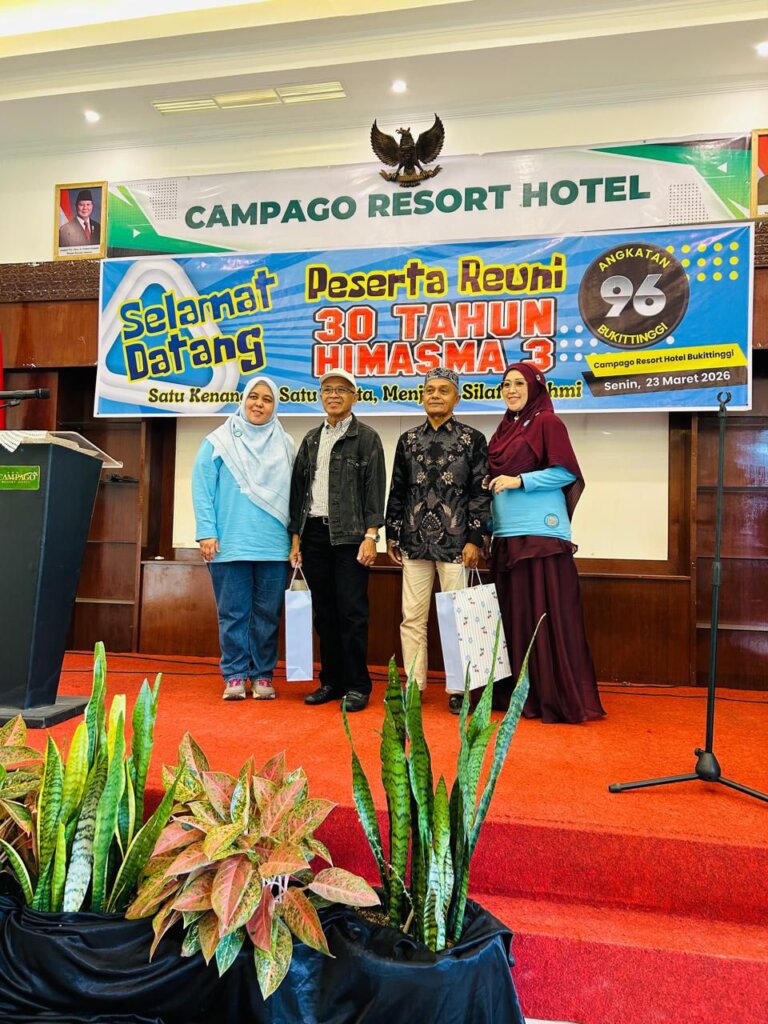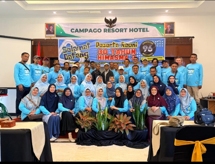 ptinggi-Dirgantaraku.com,-Reuni 30 Tahun Himpunan Mahasiswa dan Alumni HIMASMA SMAN 3 Bukittinggi angkatan 1996 telah resmi digelar pada hari Senin, 23 Maret 2026, bertempat di Campago Resort Hotel Bukittinggi. Acara yang mengambil tema “Satu Kenangan, Satu Ceria, Menjalin Silaturahmi” dihadiri oleh seratus lebih alumni beserta perwakilan guru-guru SMAN 3 Bukittinggi, dengan suasana yang dipersiapkan secara meriah terlihat dari balutan dekorasi dan spanduk selamat datang yang menghiasi area panggung.